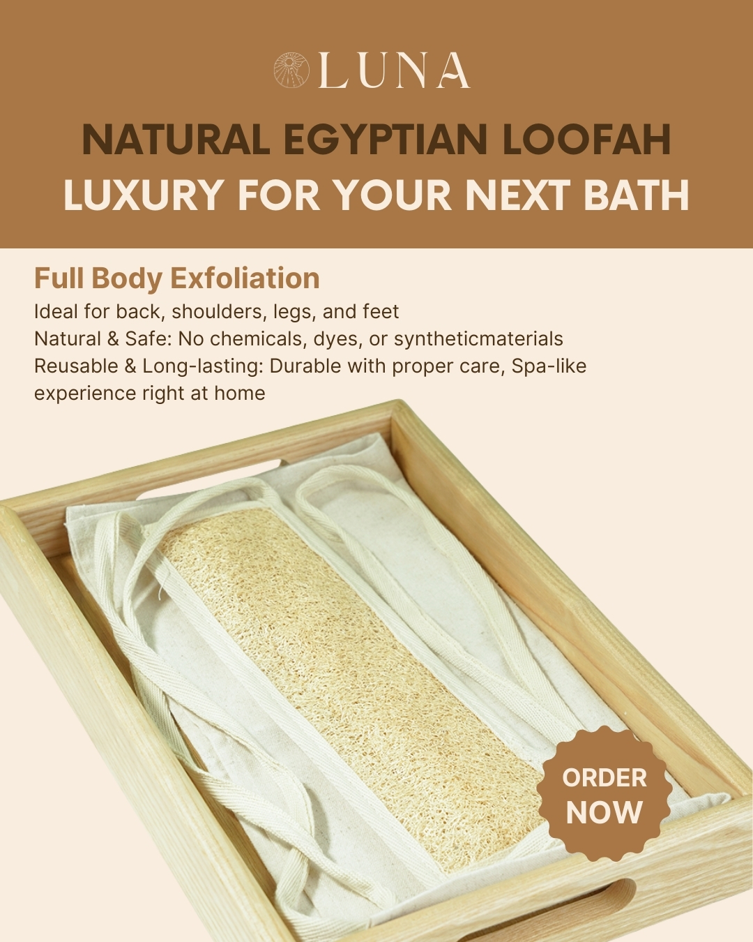 | Material | 100% Natural Egyptian Loofah (Luffa cylindrica) & 100% Egyptian cotton |